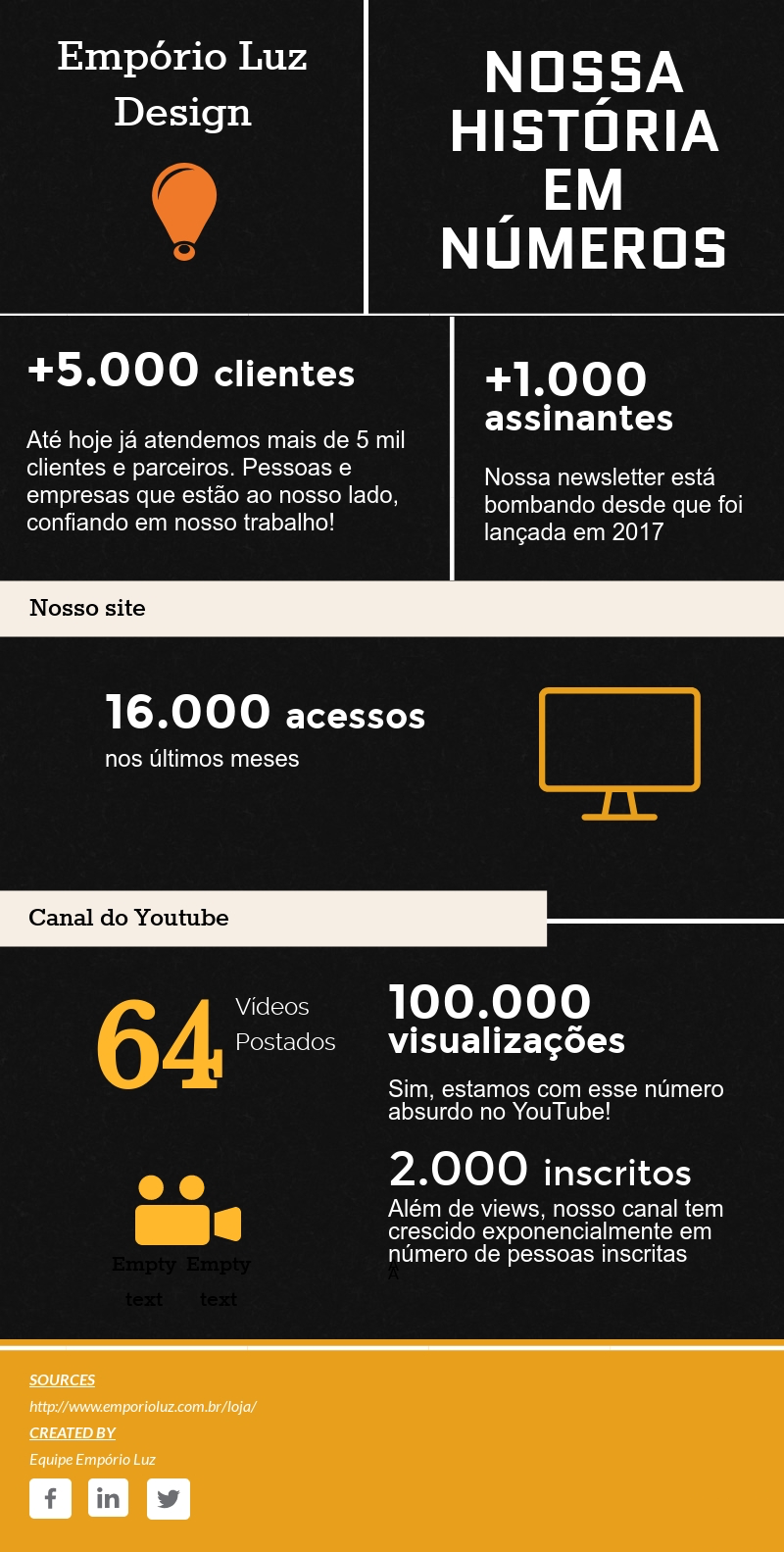 A partir daí o sucesso foi estrondoso! Hoje a Empório Luz Design é referência no seu setor, sendo amplamente divulgada pela mídia especializada e criando diariamente uma base cada vez maior de compradores fieis e satisfeitos. Confira alguns fatos e números interessantes sobre a loja: