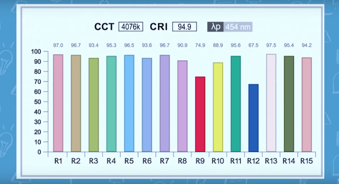 Segundos os dados do gráfico acima, do R1 ao R15 a nota mais baixa foi 98. No R9, que é o tom vermelho, deu 98%. Isso significa que ela tem um alto índice de reprodução nessa cor, tendo uma grande média de RA. Mas temos que levar em conta a questão da eficiência energética caso queiramos adquirir um produto desses.