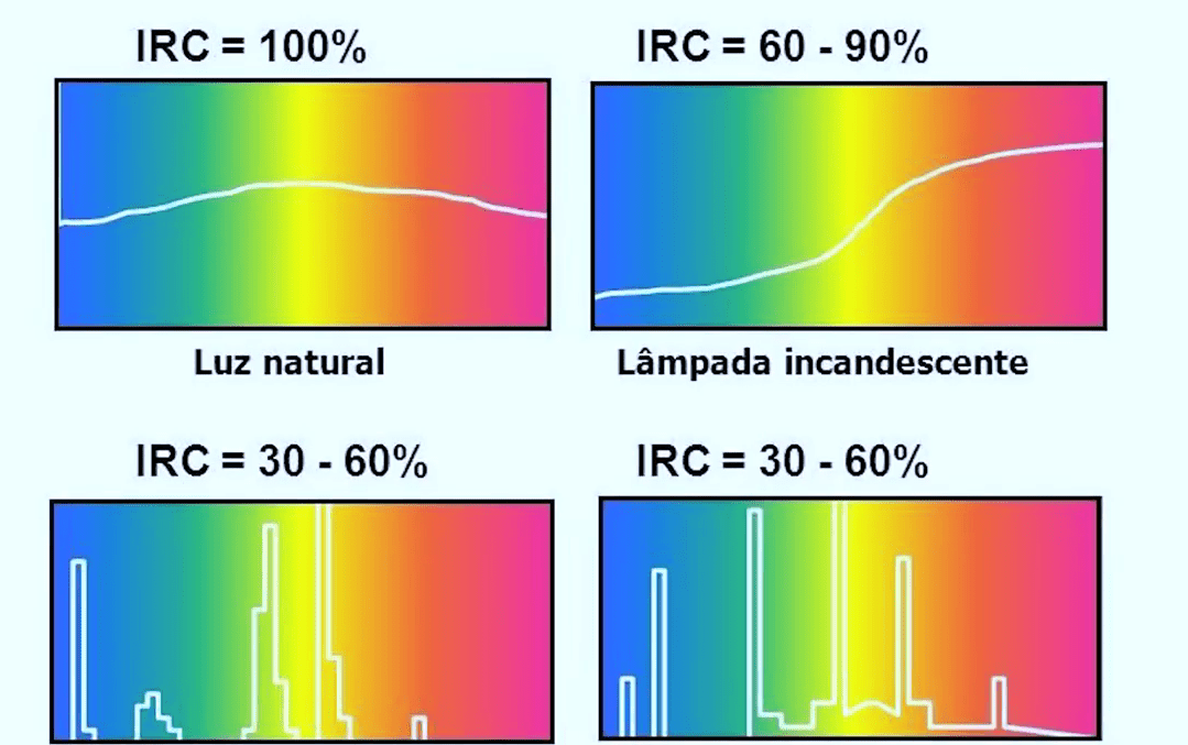 Antigamente não existia a questão do R9 pela falta de necessidade. No passado eram utilizadas lâmpadas incandescentes e halógenas, que possuem um alto R9, de quase 100%. Nosso olho nem consegue perceber o 100%. Algumas fluorescentes tem índices que vão dos 30% até valores negativos.