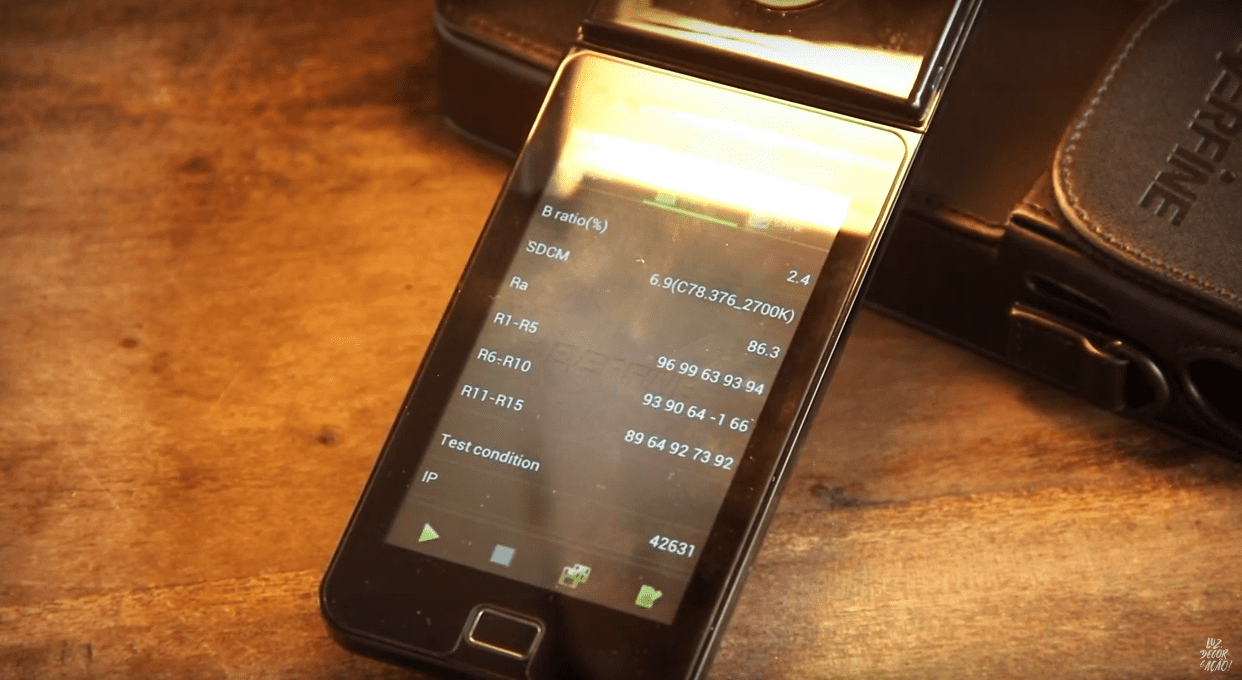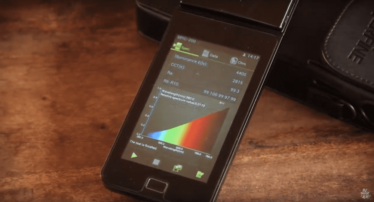 Com a ajuda de um espectômetro, vamos focar a luz no sensor do aparelho e fazer as medições. Após um tempo de carregamento, os dados aparecem em uma tela que faz parte do produto. Você pode ver isso melhor nas imagens abaixo:
