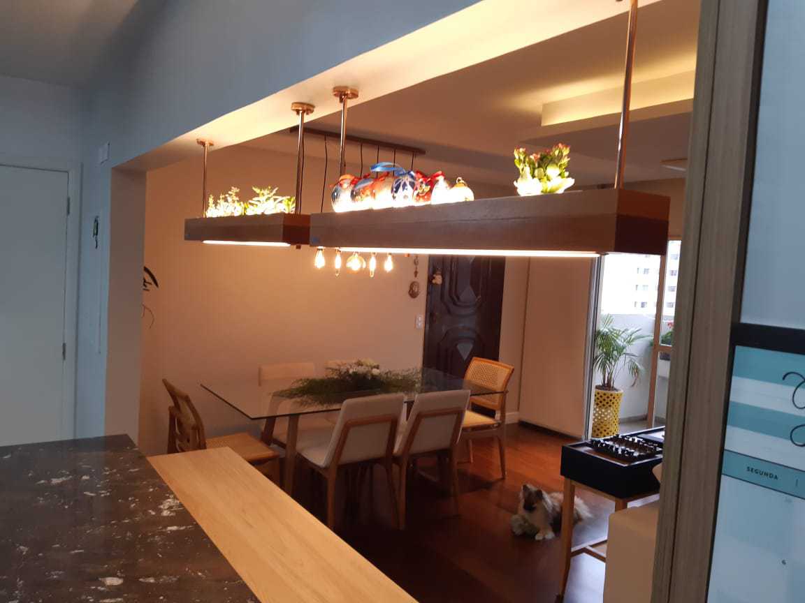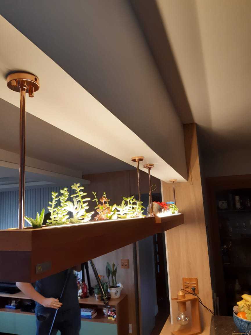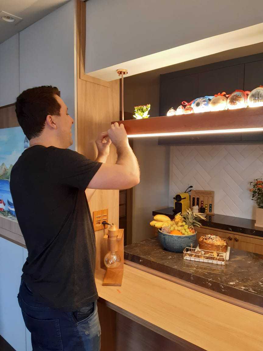 O Bruno sempre foi movido por esses pedidos especiais. Para atender o pedido do casal, ele utilizou madeira, perfil de LED 12V para ter a luz difusa e também perfil de LED com angulação, canos e driver. Esta alquimia recebeu o nome de Cedro Slim.