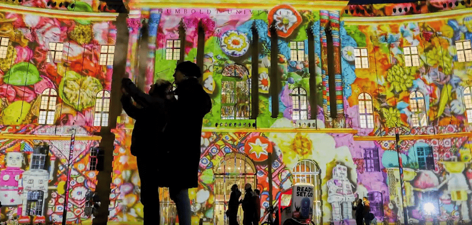 Mostrando as fotos para pessoas da área, tivemos muitas reações positivas, com uma galera curtindo o que é feito. Uma das ideias aplicadas é utilizar refletores da década de 60, que permitem até mesmo ver a transição dos slides, algo bem retrô. Ficamos sabendo depois que essa técnica chama mapping. Ela serve para mapear uma área a ser iluminada, abrindo espaço para a arte ser realizada. A comparação com o grafite vem por conta dessa área. Assim como o grafiteiro escolhe um recorte para desenhar, o recorte é feito pela iluminação, nesse caso. Todos os monumentos mais conhecidos da cidade de Berlin são ‘alvo’ dessa intervenção. Veja algumas fotos abaixo: