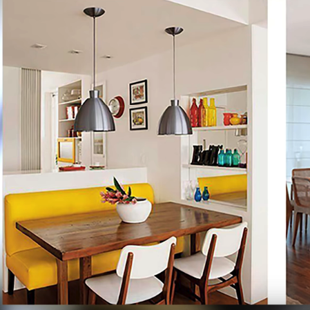 Um dos 5 erros mais comuns cometidos na iluminação é ter muitos elementos juntos. Na sala já temos dois pendentes lindos. Ter 4 no mesmo ambiente acaba ficando demais. Talvez os dois pendentes da esquerda pudessem ser modificados para um plafon ou outra peça mais simples, para não atraírem muita atenção.