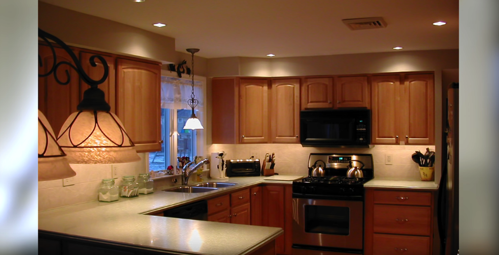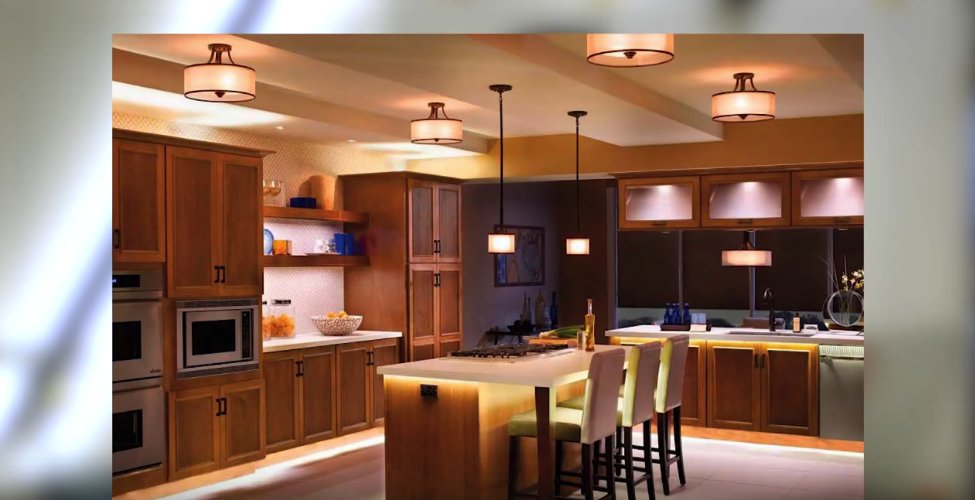 Essa cozinha tem bastante elementos de iluminação. Muitos pendentes e alguns plafons mais esticados também. É uma cozinha bem no estilo americano, sendo que a pessoa aparenta amar iluminação, afinal ela usou praticamente tudo o que podia. O lado positivo é que o tom de cor é mais amarelo, variando de 3000K a 4000K, o que faz sentido para uma cozinha para receber amigos e família.