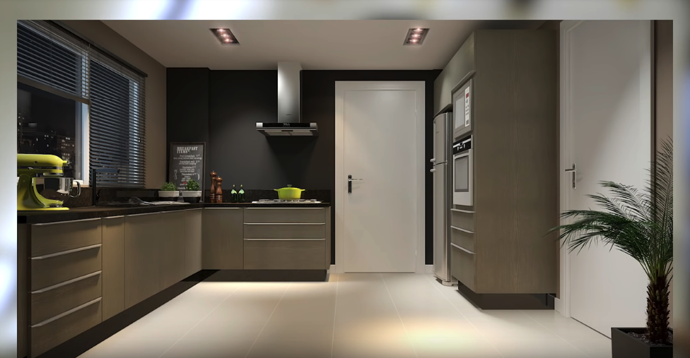 Já essa cozinha é mais clean que as demais. Isso é legal porque dá uma expandida na luz, já que o piso é branco. Para cima existe menos refletância, já que a pia e os outros elementos de decoração são mais escuros. Existem apenas dois spots com três lâmpadas no teto.