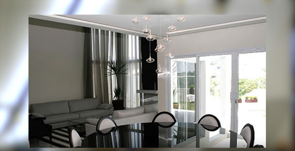 O primeiro ambiente é um baseado em pendentes, tendo o clássico Pendente Bossa-Nova aparecendo em sua estruturação. A mesa é branca, tendo uma composição legal com as cadeiras. Na traseira há uma luz pontual, sendo possível utilizar quadros ou outros elementos para focalizar.