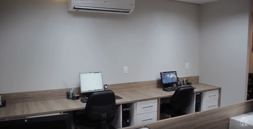Por ser um ambiente comercial, optou-se por cores claras, trazendo suavidade a um ambiente que pode ser estressante. Explicamos um pouco sobre isso neste vídeo. Um trunfo neste projeto foi a utilização de madeira, que funcionou como uma forma de trazer aconchego ao ambiente.