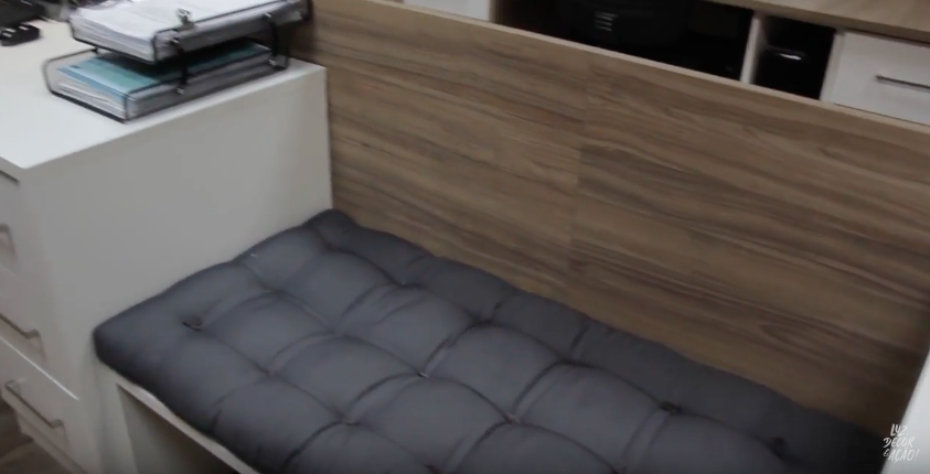 Como havia a necessidade de acomodar 5 pessoas, além de clientes e visitantes, a opção escolhida foi de utilizar móveis planejados. Dessa forma o pequeno espaço foi melhor aproveitado. Uma das soluções mais interessantes está na imagem abaixo: