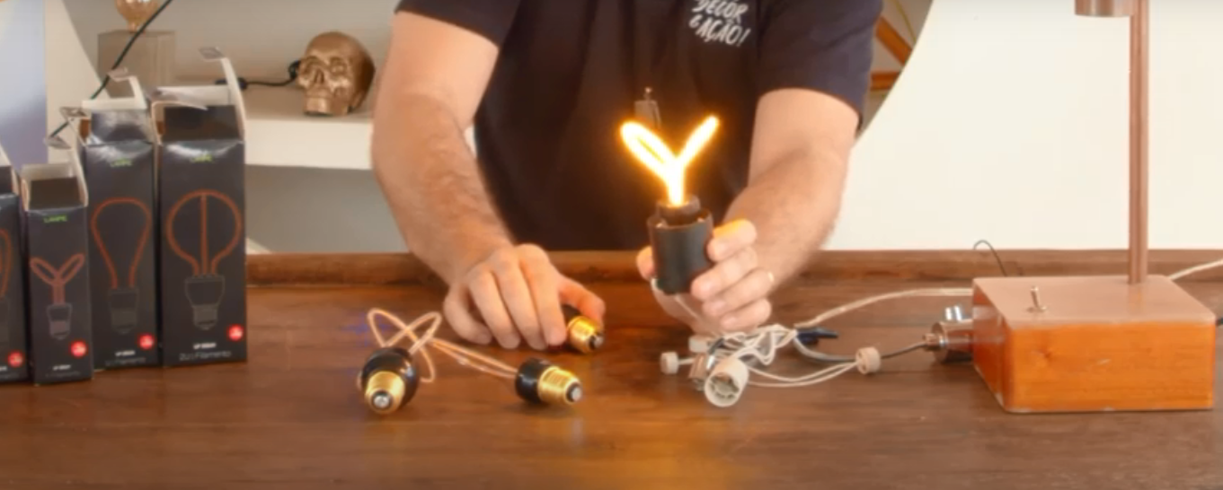 Percebam a lâmpada de filamento LED com efeito neon Y. Ela traz o formato da letra Y e uma iluminação diferenciada. Com esse tipo de lâmpada, você pode soltar sua criatividade e trazer elementos únicos para a sua decoração.
