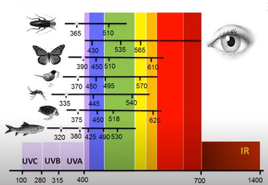Perceba que a maioria dessas espécies têm sensibilidade maior aos tons de ultra violeta, azuis e amarelos. Note que esses são justamente os tons presentes na composição das tonalidades das cores frias e neutras da iluminação.