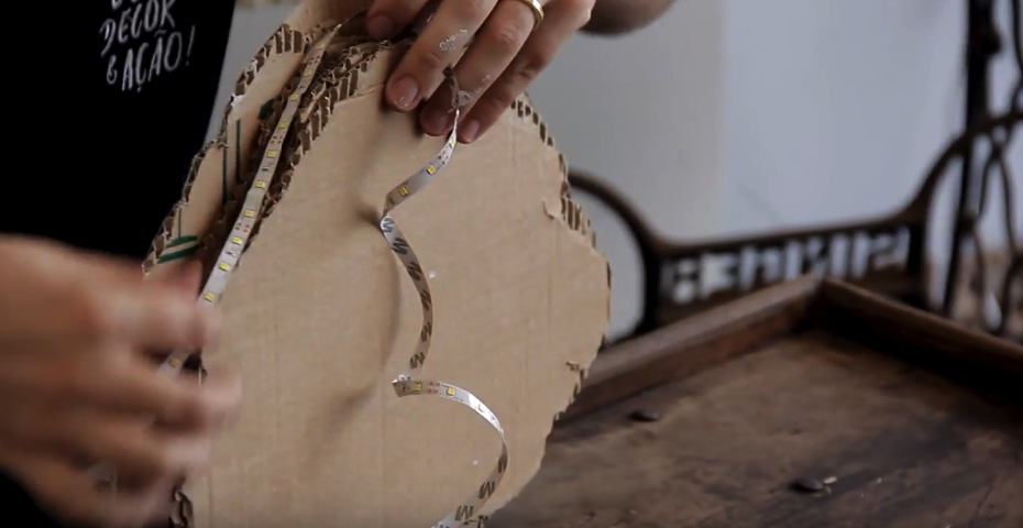 Com a fita de LED, iremos iluminar a peça criada até agora! Para isso a fita deve ser colocada no entorno da peça, conforme podemos ver na imagem abaixo: