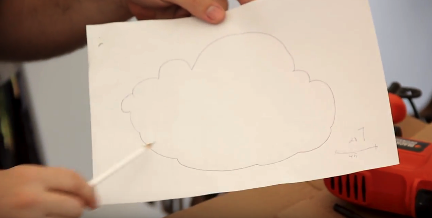 Depois que tiver cortado e colado os cartões de papelão, use um cartão um pouco maior. Corte uma nuvem de 27×40 cm. Esse cartão será usado como fundo da luminária.