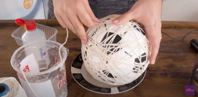 Envolva o barbante na bola. Esse é o passo que dará estrutura e forma a luminária. Aqui você pode fazer com o espaçamento que preferir, desde que respeite a área delimitada no passo 3, deixando o espaço para fazer as manutenções.
