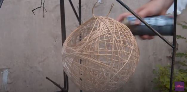 Pinte a estrutura com o auxílio do spray na cor escolhida. Depois de secar e retirar a bola, pinte a estrutura de barbante com um spray; assim, você dará o acabamento final à sua luminária. Você pode pendurar a estrutura com o auxílio de um ganho, dessa forma evitará desmanchá-la manuseando com as mãos. Veja como fizemos: