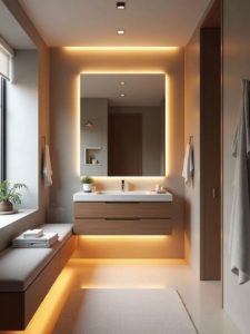 Similarmente, certifique-se de que a iluminação seja suficiente para atividades de higiene pessoal. Ainda assim, evite luzes muito frias que possam criar um ambiente hospitalar.