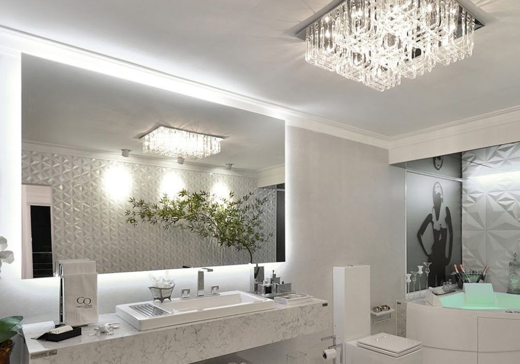 O espelho é um dos objetos mais usados na casa, então ele merece uma iluminação dedicada e bem pensada. A iluminação em torno do espelho deve ser uniforme, evitando sombras que possam distorcer o reflexo. Iluminar as laterais do espelho ou utilizar luminárias embutidas na parte superior são ótimas opções. Considere, ainda, a instalação de luzes LED em torno do espelho, pois elas oferecem uma iluminação suave, que minimiza sombras e proporciona uma visualização mais precisa e agradável. Outra boa opção é adicionar luz indireta atrás do espelho com um bom fluxo luminoso, assim você pode obter efeitos diferentes do que a luz direta oferece.