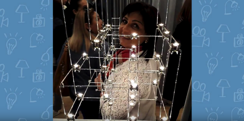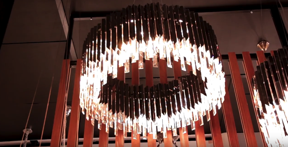 Trata-se de uma peça chamada Blast, que ganhou um prêmio de inovação pela Revista Lumière. A fibra ótica utilizada nesta peça é perimetral, aquela utiliza em piscinas. O conceito italiano de vidro soprado está presente aqui também. Na ponta temos cristais Swarovski, que expandem a luz dando um efeito muito interessante.