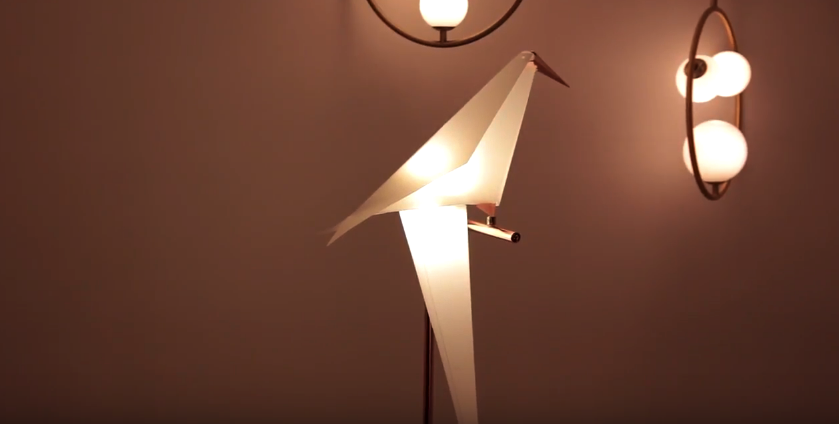 No estande da Starlux, conversamos com o pessoal da Impacta, responsável por uma luminária em forma de pássaro. Ela é uma réplica da obra de um designer e arquiteto londrino, conhecido por suas criações funcionais e divertidas. Seu desenho lembra o de um origami, arte oriental de dobraduras com papel. O acabamento da peça é em cobre.